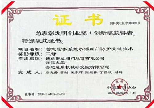 2020年11月21日,博纳斯威与武汉大学、合肥通用机械研究院有限公司联合完成的《管道输水系统水锤阀门防护关键技术》获得2020年度中国发明协会—发明创新奖二等奖。研发团队通过对阀门结构创新和水力性能优化,提出了供水管 [
