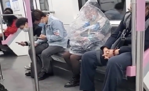 大妈坐地铁吃香蕉 身体套塑料袋令人诧异!拍摄者:感